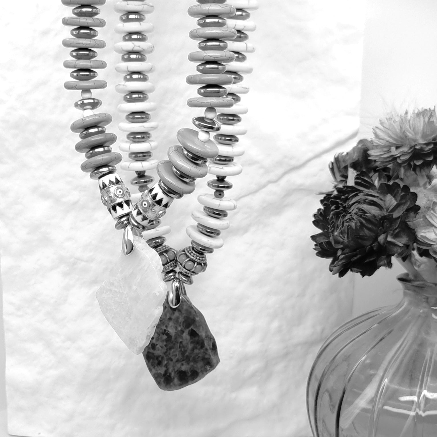 Dès mes premières créations, certaines pièces se sont démarquées naturellement. Des colliers en perles de Howlite, des pierres naturelles brutes, des courbes singulières… Des bijoux forts et colorés qui reflètent vraiment mon univers.
